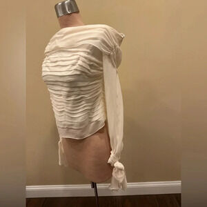 A stunning Tadashi for Neiman Marcus silk blouse that embodies timeless elegance—perfect for brides, rehearsal dinners, or engagement celebrations. Crafted from luxurious ivory silk, this off-shoulder design features elegant horizontal ruching through the bodice and sheer chiffon sleeves tied into romantic bows at the wrists. A sophisticated choice for modern brides seeking understated glamour.