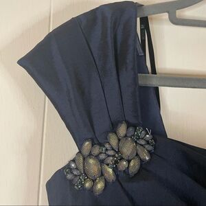 This beautiful gown is in excellent pre-owned condition. It is navy blue with gathering on one side of the bodice, and gather off the shoulder sleeves. There is a jewel embellishment on one side of the dress as well. It’s perfect for a winter wedding guest dress!