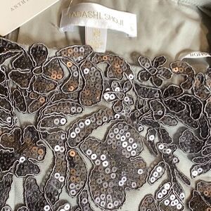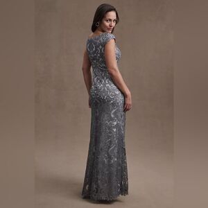 The Tadashi Shoji Odette Column Gown makes a stunning choice for mothers of the bride and guests attending black tie affairs. The sequined boatneck style blends glamour with a bit of vintage flair; its lace overlay is studded with hundreds of matte sequins arranged in a stunning blooming pattern, while the slight cap sleeve offers the perfect amount of coverage. The maxi length falls gracefully to the floor, and slight fringe detailing along the sleeves and hem offer a sweet finish.