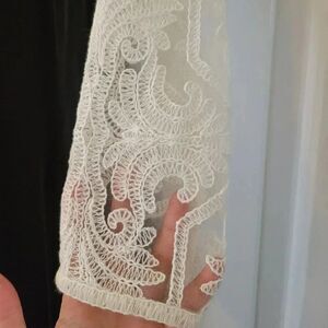 For a jaw-dropping option, look no further than this black and white stunner. An ivory bodice cut from luxurious cotton embroidered tulle is paired with a black stretch crepe skirt. Unlined long sleeves allow just a hint of skin, creating a look of both allure and sophistication.