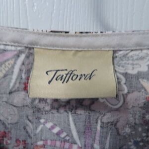 Beautiful black short sleeved Tafford scrub top with floral pattern in grays, maroons, pinks, and purple. It is a size XS and features a v-neck, short sleeves, and 2 large pockets in the front. It is approximately 24 1/2 inches long, 20 inches from pit to pit, and 21 1/2 inches across the bottom of the scrub top.