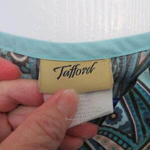 This green paisley scrub top has tones of green, aqua, brown, and tan. It looks great with brown or green scrub pants. This medical top is a size extra small, Tafford brand. It has deep 7 inch pockets in the front , a v-neck, and small side splits for comfort. It is made from cotton and is machine washable in cool water.