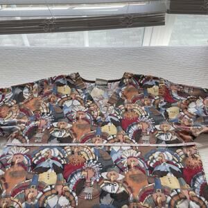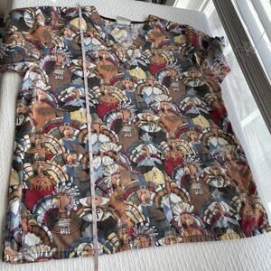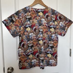 Tafford Thanksgiving Turkey Festive Scrub Top Size M Fall Colors V Neck Cotton
