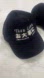 Set of two black corduroy caps featuring unique embroidery. One cap has a red heart design, and the other has white text embroidery.