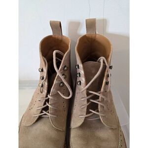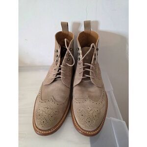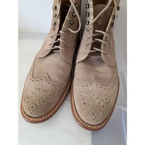 The Mack Boot is an instant classic. A full brogue, seven eyelet wingtip combat boot on a stacked leather sole, this is the most expensive boot that our factory can produce, featuring full-grain Vachetta natural leather, the best skin possible for a boot, and handpainted for a stunning finish. All of the pieces of the Mack Boot are cut by hand (rather than by machine or laser), highlighting the craftsmanship and pride that goes into making each one. The double leather sole with mountain rubber inserts will provide durability, comfort, and grip in all conditions.
