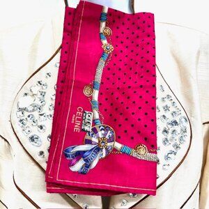 #54 New with Tag On CELINE Paris Avenue Montaignez MiniScarf/Handkerchief cotton/silk made in Japan 21" Square in Dark Pink black dot neckless designed is a luxurious and stylish accessory perfect for women looking to add a touch of elegance to their outfits.