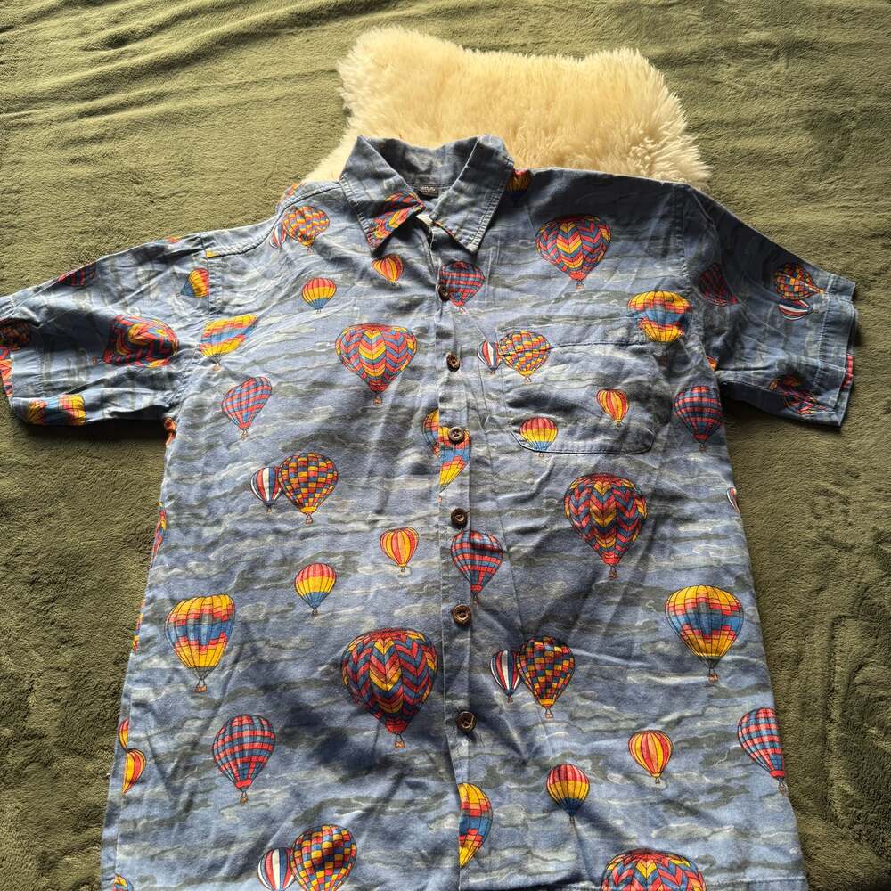 Vintage David Carey Originals Hot Air Balloon Shirt. This vibrant short-sleeve button-up features a playful hot air balloon print on a blue sky-like background. Made from 100% cotton, it's perfect for a unique casual look. The shirt is in excellent pre-owned condition with no stains or holes. Size M, made in Thailand.