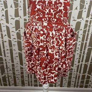 Additional Details: Great abstract floral print with subtle pops of gold on the sides, 2 fully functional hip pockets, ties around neck and waist.
