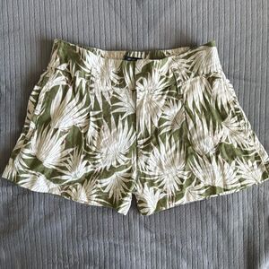 100% linen pleated shorts with a tropical green, white, & pink pattern. Side pockets and one back pocket. Size Medium. Measurements in photos