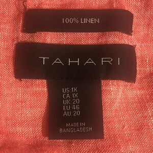 Tahari 100% Linen popover Lagenlook blouse with roll tab sleeves and back button detail. Coral color. Size 1X . 25” ptp and 28” shoulder to hem. EUC