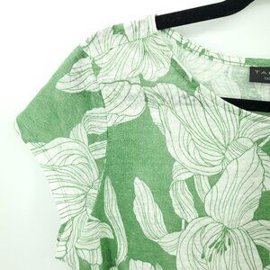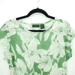Tahari 100% Linen Short Sleeve Botanical Print Tee/Top M Green/Cream
