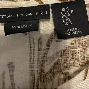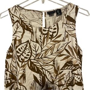Tahari 100% Linen Sleeveless Leaf Print Shift Dress Size S. Pre-owned, clean, no condition issues to note. Pullover style with a single button closure at the back neck. Has pockets at the sides. Falls just below the knee. Non smoking home.