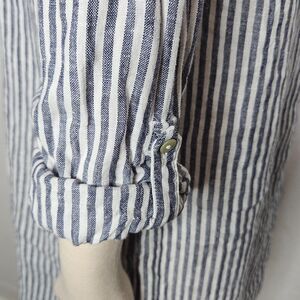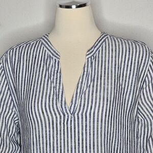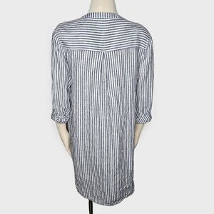 Tahari 100% Linen Striped Tunic Dress Blue White Roll Tab Sleeves Pockets Size L