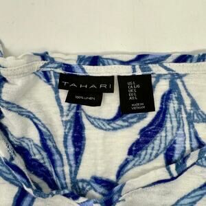Tahari 100% Linen T-Shirt Tropical Blue Leaf Print Short Sleeve Top Size LRG EUC