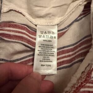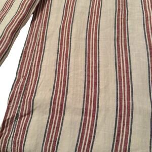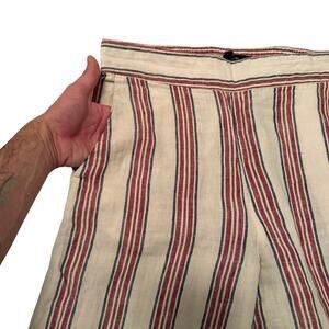 DESCRIPTION: Gently worn linen pants feature a wide leg silhouette with red and blue vertical stripe pattern on a cream background.