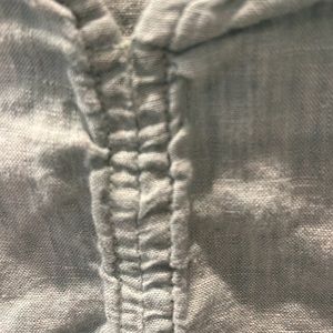 Warm wesather staple in a size small. Washable linen( this the wrinkles). Easy to iron just freshly washed. Perfect piece with linen pants , jeans or cutoffs. Great item. Perfect condtion other than wrinkles. :).