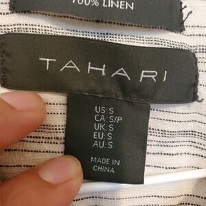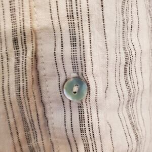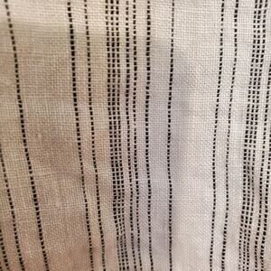 100% lightweight linen. white with charchoal grey pinstripes. opalescent button front, high/ low ruffled peplum hem. Good preowned condition.