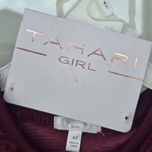 The Tahari 2 Piece Set Outfit in size 4T is a stylish and versatile option for young girls. The green and red colors add a festive touch, making it perfect for various occasions such as parties, casual outings, or formal events. This set includes a pullover sweater and matching pants, made from a blend of polyester, spandex, and cotton for comfort and durability. The vintage-inspired pieces are machine washable and feature a lightweight design, making them ideal for the winter and fall seasons. Made by the brand T Tahari, this outfit set is a fashionable choice for any girl's wardrobe.