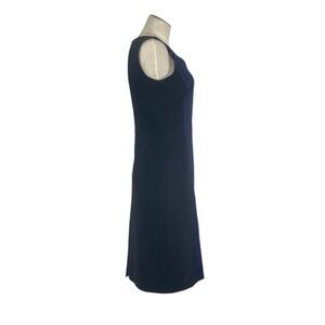 Look and feel elegant in this tailored sleeveless midi length pencil dress featuring flattering high v-neckline and gorgeous navy blue brocade/embroidered front panels. Back Zip. Back and sides are black. Satin lined.