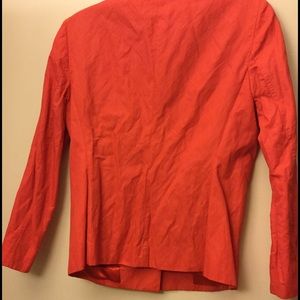 Burnt orange Tahari 3/4 sleeve jacket. Size 2. Lined. No collar. Rouching detailing on front. Hidden button (5) closure in front. 2 faux pockets in front. This was only worn a couple of times. The overall fit was slimming and flattering but the arms were a little restricting for me to be comfortable. Note that the jacket material is naturally textured for visual interest.