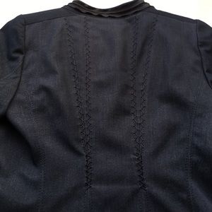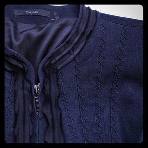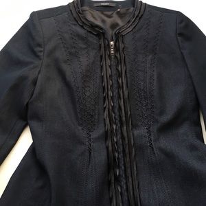 Tahari. Zip front. 3/4 sleeve jacket/blazer. Lightweight dress denim with black detail on front of jacket, jacket lining is the same material. Mock collar. Stitching detail on front and back add texture, detail, and visual interest which serve to highlight tiny waist and sleek, slender fit. Wear open or closed to accentuate slim curves.