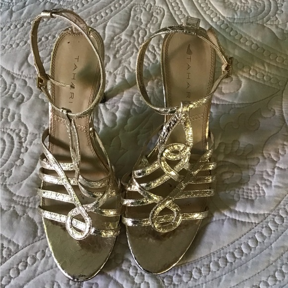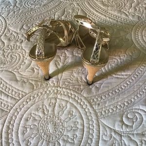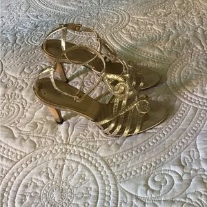 Elegant and dressy 4” heels gently used classy light gold strappy sandals are perfect for holiday outing on a budget.