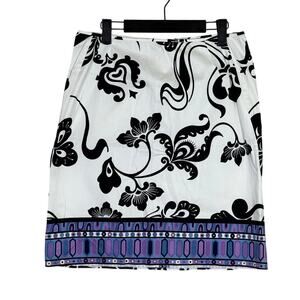 Tahari A Line Floral Whimsical Knee Length Stretch Pencil Skirt Zip Closure 10 Colorful White Purple Blue