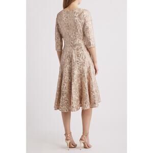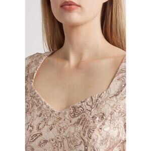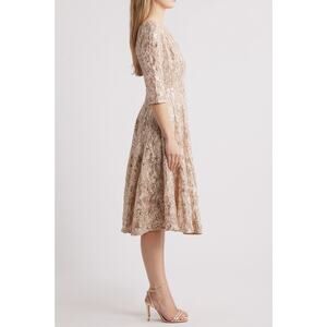 Shimmering beads and sequins illuminate the floral design of this occasion-ready dress complete with a sweetheart neck and A-line silhouette.