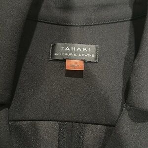 This sophisticated black sheath dress by Tahari ASL features a notched collar and a flattering wrap-front V-neckline. Designed with three-quarter sleeves, it offers a polished look suitable for both work and cocktail occasions. The dress's minimalist design and structured fabric ensure a timeless appeal.