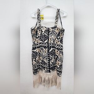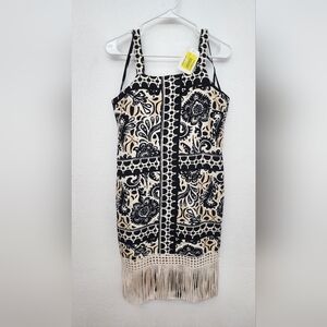 Tahari ASL Black and White Floral Mini Dress With Fringe