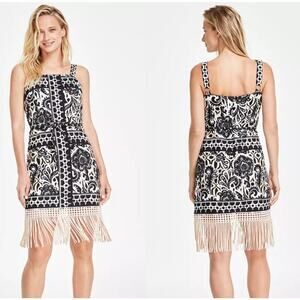 Tahari ASL Border Print Dress Sleeveless Fringe Trim Sheath Mini Black White 12
