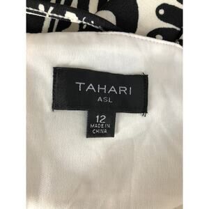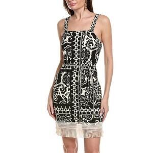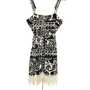 Tahari ASL Border Print Dress Sleeveless Fringe Trim Sheath Mini Black White 12