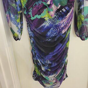 Tahari ASL Dress; smocked printed mesh, long sleeve; size 2,