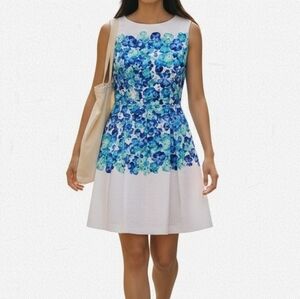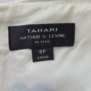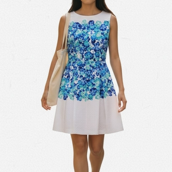 Tahari ASL Dress Size 8P White Blue Floral Sleeveless Box Pleat Pockets Textured