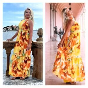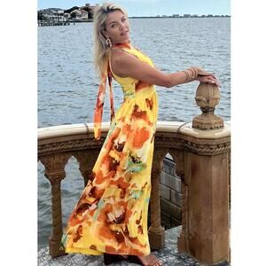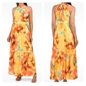 Tahari ASL Floral Print Halter-Neck Tie-Back Chiffon Maxi Dress 10 Yellow Orange