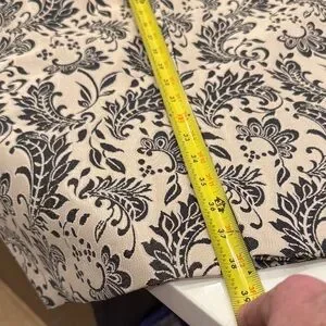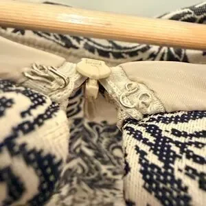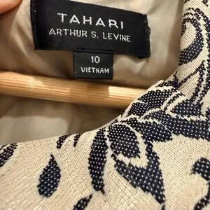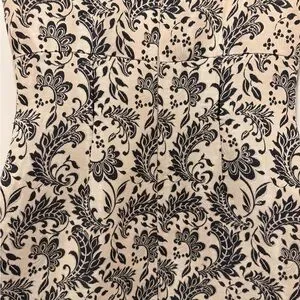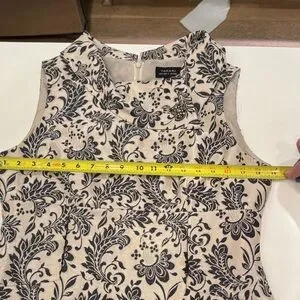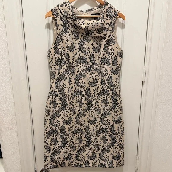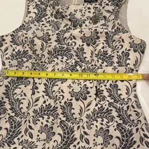 Elegant mini dress with intricate black patterns on a cream background. Sleeveless design with a sophisticated look. Ideal for stylish outings. Birch has no pieces missing. Sophisticated and classy. Perfect for any formal event.