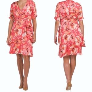 New with tags Tahari ASL floral wrap dress featuring a chic ruffled design.