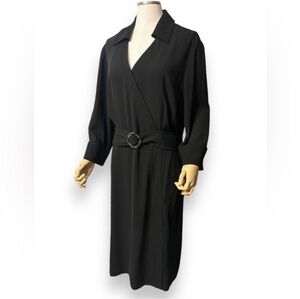 Modern abstract geometric print sheath dress with faux wrap that gathers at left hip for a flattering fit