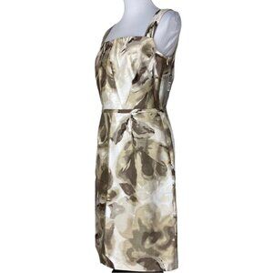 Tahari Arthur S Levine women's size 6 dress, it is the Derek sheath style, color is tan and ivory cream with floral sheen print, sleeveless, square neckline, knee length, lined, back slit and side zip closure. Materials shell 100% polyester, lining 100% acetate. Care dry clean. RN#106409 Condition is new with tags as shown in pictures. Please preview the measurements to ensure fit.