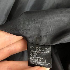 Women's black and white pinstriped two-button blazer suit jacket. Single-breasted, two button front closure, notch lapels. Collared neckline, long sleeves with button cuffs, shoulder pads. Pockets basted shut, lined.