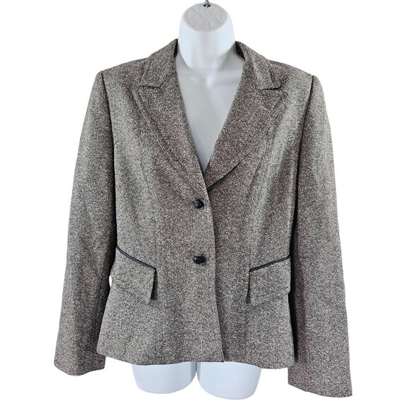 Elegant Tahari Arthur S. Levine wool silk blazer in size 10. This brown, marbled blazer features a two-button closure and zipper flap pockets, perfect for a polished, professional look.