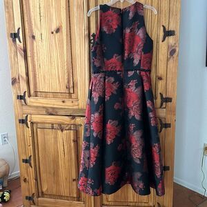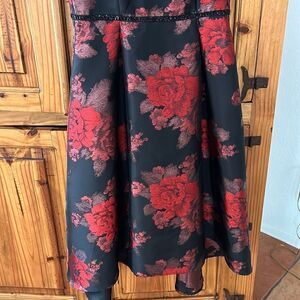 Fully lined black with red and areas of lighter red shimmer. Tea length. Hi Lo hem. Beading at waistline. Polyester and elastane with metalllic threads. Pit to pit measure is 19 inches. Length is 45.5 inches in front and 50 inches in back. Zipper in back.