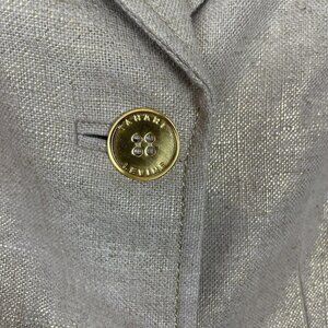 Very good pre owned condition. Has a little wear under arms. Jacket is a tan color with gold metallic threads woven through. Dry clean only. Linen cotton blend.