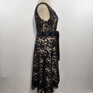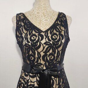 Tahari Arthur S Lavine Women's Size 8 Black Floral Embroidered Lace Overlay Ribbon Accent Sleeveless V-Neck Side Zip Belted Dress Party Cocktail Evening Event Festive Gently Pre-Owned Excellent Condition Reasonable Offers Welcome