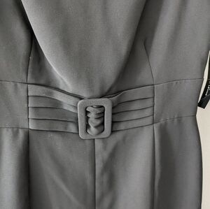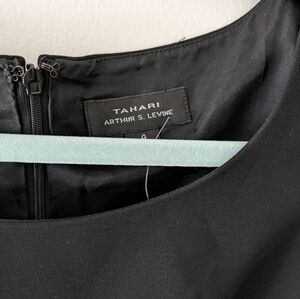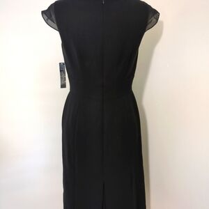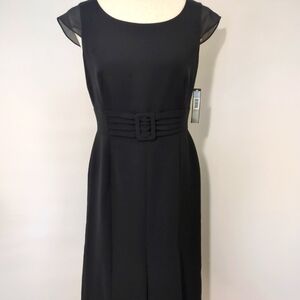 Tahari Arthur S. Levine Benjamin black dress with sheer cap sleeves, buckle front, and sheer kick pleats. Zipper back and fully lined. 17" pit to pit, 30" waist, and 39" from the shoulder to the bottom of the dress. Size 4. NWT