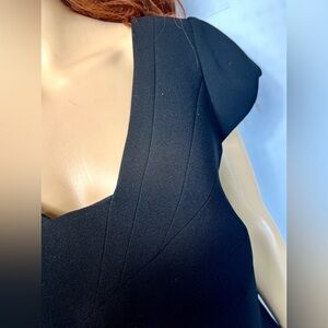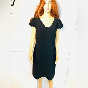 Great work dress by Tahari Arthur S Levine in size 12. Graphic black& white lining. Below the knee, belt loops (no belt) and interesting diagonal stitching and square v neck detail. Cap sleeve.