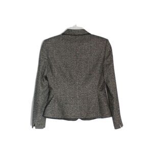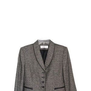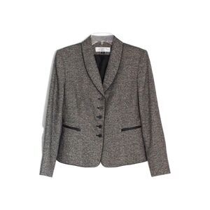 Tahari Arthur S Levine blazer in a flecked gray color. Fabric is a blend of wool, silk, polyester, and elastane. Single-breasted features black piping accents and a shawl lapel style. Long sleeves with no buttons. Padded shoulders. Four-button front. 100% polyester lining. Dry clean. Size 4P. No tears, rips, holes or stains.