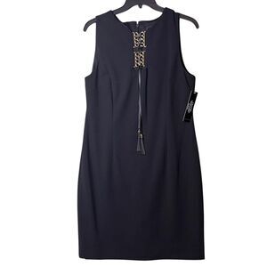 Item: Womens sleeveless sheath dress with decorative chain-laced neckline and tassel tie detail