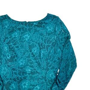 Make a statement in this stunning Tahari Arthur S. Levine emerald green lace sheath dress! The elegant floral lace overlay and nude underlay create a timeless and refined look.