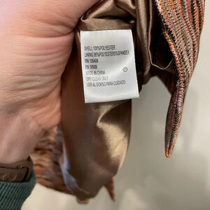 Polyester & Spandex, lined, zipper back. Black, orange, white.